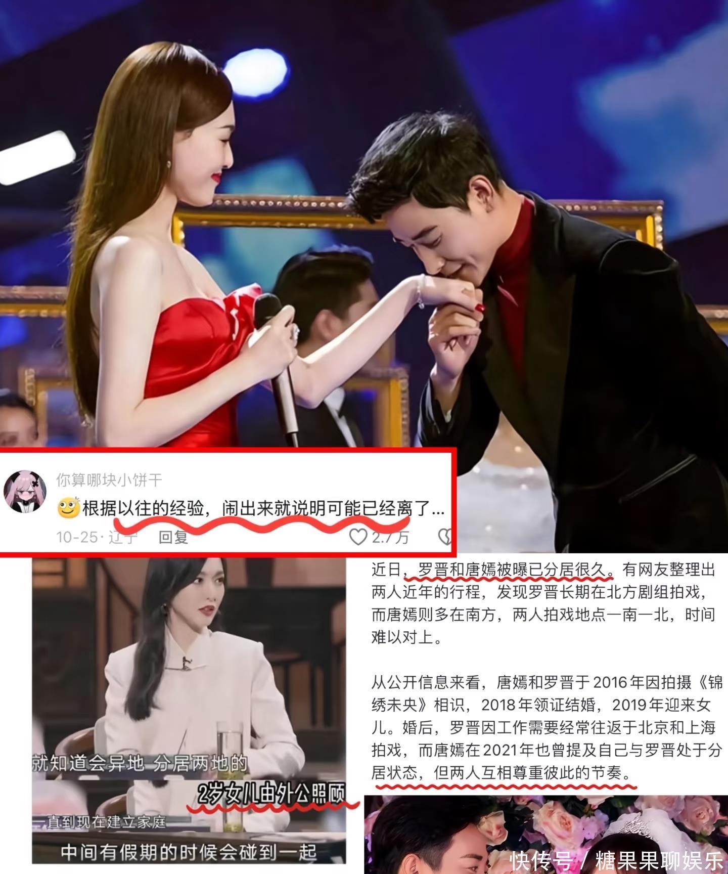 但其实罗晋压根就不是很宠爱妻子,唐嫣面临的也不是娇妻生活,她本人也讨厌这种说法,之所以认定圈内伴侣,就是觉得对方可以理解同为演员的工作状态,而这对夫妻的家庭带娃重任,其实都集中在唐嫣和唐嫣父母身上。两人处于长期异地恋爱中,罗晋常年在外拍戏,2023年两人在一个城市的时间不超过10天,唐嫣定居上海照顾女儿,最新采访中也多次强调女性应该独立,让粉丝觉得这很不对劲。