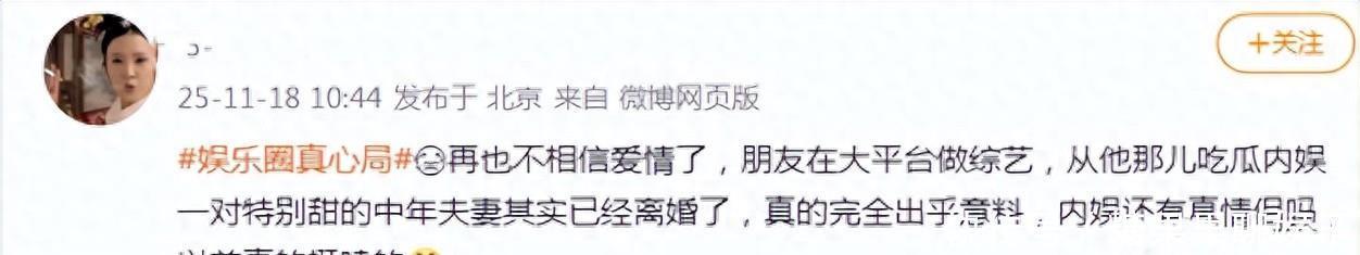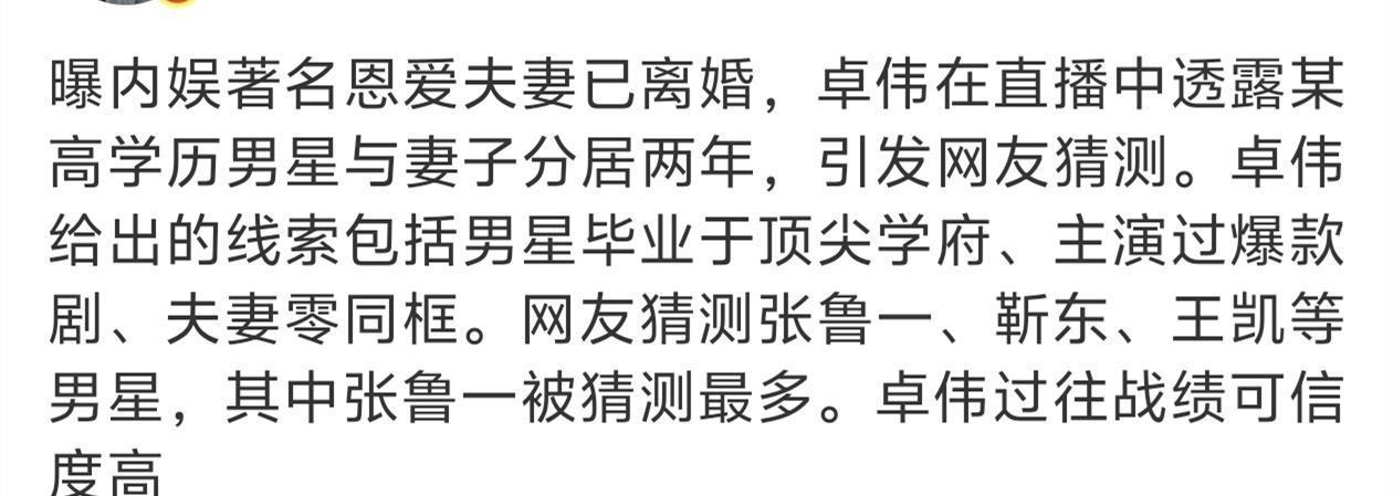 近日,卓伟透露圈内高学历男星已经离婚,夫妻感情破裂。随后有知情人表示自己对爱情的信任快要没了,因为身边朋友是在大平台做综艺的,结果从他那里吃瓜到圈内一对特别甜的中年夫妻已经离婚了,这件事情听起来完全出乎意料,为此对于内娱的爱情真的没办法相信了。看起来这对夫妻对外的形象都蛮好的,受众也比较多,你知道是哪一对吗?